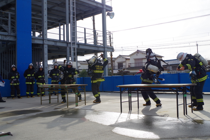 濃煙の建物内へ進入する際、必要となる空気呼吸器の着装訓練の様子。