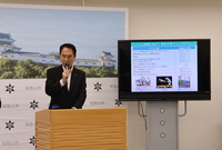 おはようございます。今日はちょっと時間調整がうまくいかずに9時の発表になりました。申し訳ありません。本日の発表項目4項目ございます。まず脱炭素社会に向けての社会実験を行いたいと思います。青岸汚泥再生処理センターで浄化槽汚泥だとか、し尿の方の汚泥を再処理しているんですけども現在は脱水してから、焼却して電気でエネルギー回収をしています。それだとどうしても二酸化炭素が出るということで今回、二酸化炭素の出ない有機質肥料化の社会実験を公募で行いたいと思います。公募要領については28日に発表させていただきます。予算額については上限1000万円。そして処理する量については300トンから500トン程度ということで、図にありますように、まず再生処理センターに集まったし尿あるいは浄化槽汚泥を有機質肥料化してもらって、遊休農地の特に利用に使えればと。そうすると遊休農地の解消にもつながっていく、そして今特にリン系の肥料が非常に高価だということでリンも十分含まれるので、そうした化学肥料の節約にもつながるということで一石二鳥を狙っていきたいと思っています。試験項目としてはまず堆肥化できるか、二酸化炭素も発生させないということ、それと遊休農地の解消に向けて遊休農地の再生につながるか、そういった視点で今回公募を実施させていただいて優良な企業について採用していきたいと思っています。脱炭素に向けて大きな一歩になるということを期待しております。