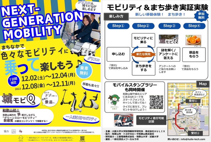 本実験は大阪大学とHULIXがNICT(国立研究開発法人情報通信研究機構)から委託された研究事業の一環として実施するもので、実証期間中は和歌山城公園内において複数種類のモビリティ運行や回遊施策を実施すると共に、プライバシーに配慮した形で来訪者の移動・行動データを計測します。得られたデータをデジタルツインPFで処理し、モビリティ運営や交通リスクの調査などに活用するとともに、和歌山市の未来の街づくりに向けた回遊施策やモビリティの導入検討などへの活用可能性を検証します。