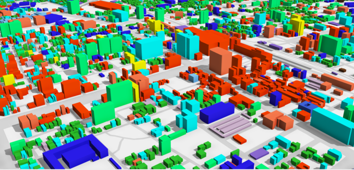 3D都市モデルとは、現実の都市空間をデータ上で再現した3Dの「デジタル地図」です。都市空間に存在する建物や街路といったオブジェクトに、名称や用途といった都市活動情報を付与することで、都市空間そのものを再現しています。